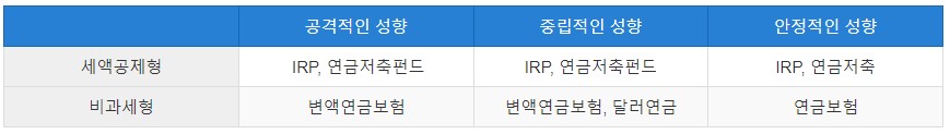 개인연금은 종류가 많기 때문에 성향에 따라 선택할 수 있는 장점이 있습니다. 세액공제형 개인연금과 비과세형 개인연금으로 나눠서 성향별로 추천해 드리도록 하겠습니다.