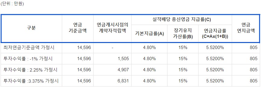 최저연금기준금액 : 약 1억 4,600만원 (원금대비 약 200%)